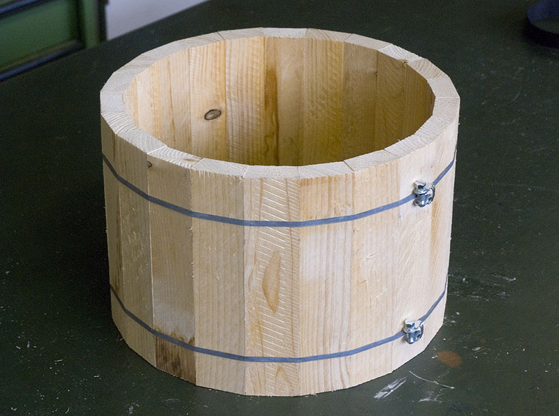 Example of a barrel hive box with 22 staves. No gluing, just strapping!