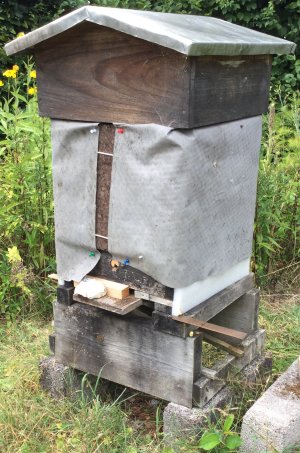 The hive on the right has the addition of a breathable, weatherproof fabric wrapping. |